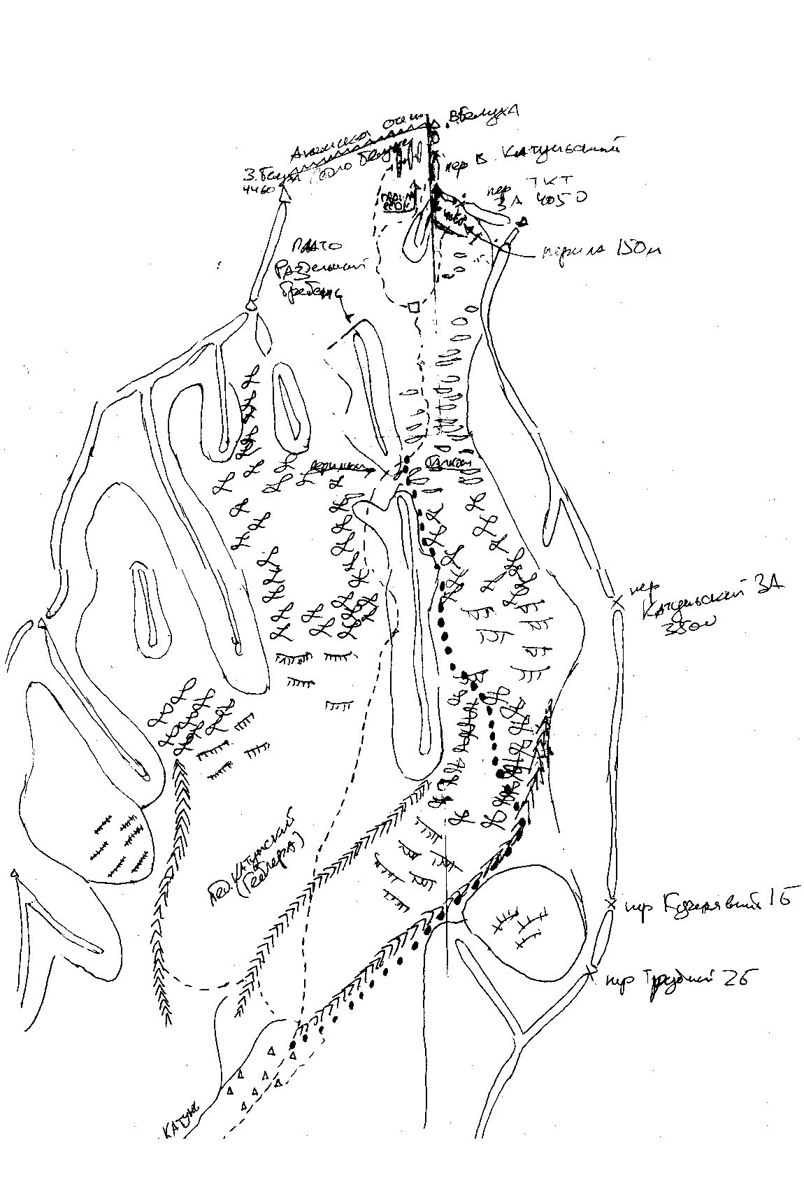 Есть два пути: по центральной ветви ледника Катуньского (л. Геблера) и по левой (орогр) (л. лев. Геблера). Центральный вариант проходится по льду и скалам по стыку ледника и гребня, этот путь обозначен на схеме тонкой штриховой линией. Так идти проще при большом количестве снега.