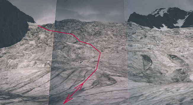 Однако в последние несколько лет происходит заметное сокращение ледников и снежников в этом районе, так что здесь описывается путь по левой ветви ледника. В отличающихся от первого пути местах путь обозначен жирными точками.